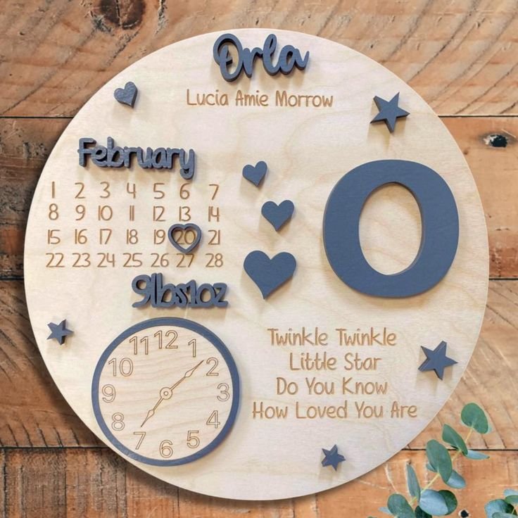 Welcome a newborn with this beautiful, custom-made wooden birth announcement board. Crafted from premium MDF and finished with precision laser cutting, this plaque includes the baby’s name, birth date, time, and weight detail, along with playful symbols like stars and hearts for a delightful decorative touch. The board also features a mini calendar and clock for recording those special birth details, making it a unique and memorable gift for parents and a standout addition to nursery decor.