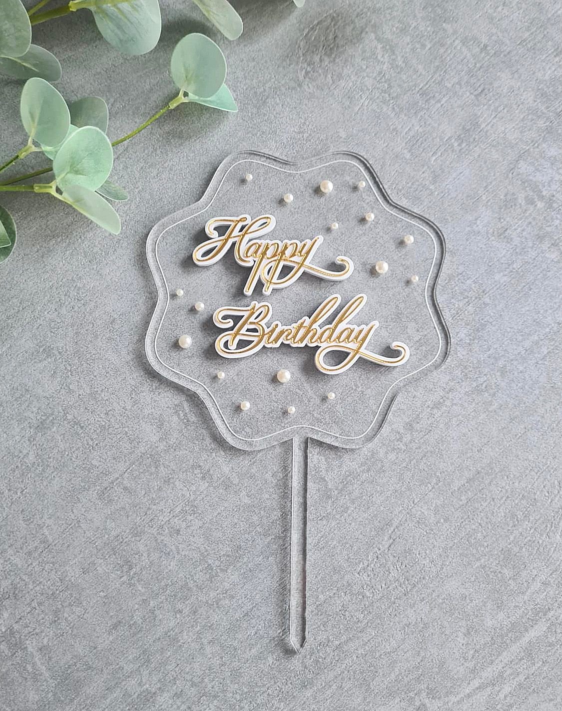 add a special touch to your celebration with this elegant Happy Birthday cake toppers. Crafted in a charming floral shape with a lustrous finish, the topper features stylish gold lettering and delicate pearl accents for a luxurious look. Perfect for birthday cakes, it instantly elevates any party setting and serves as a beautiful keepsake for memorable occasions.